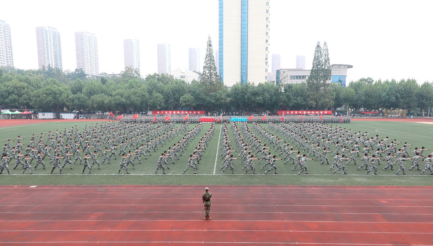 指挥员下达命令后,分列式正式开始,各方阵依次通过主席台。随后,军体拳、格斗术和匕首操等军训特色科目展示依次登场。
