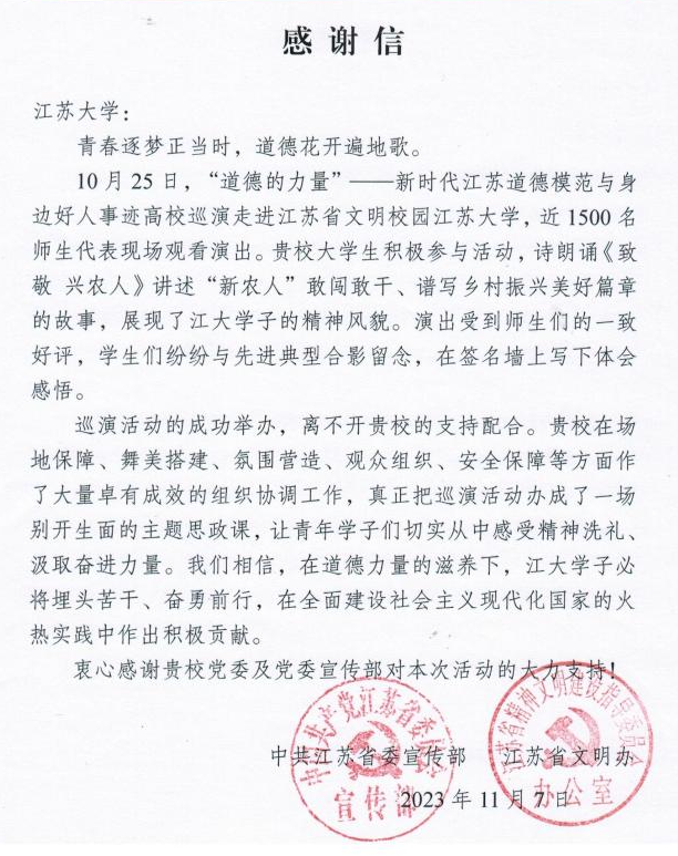 近日,江苏省委宣传部、省文明办向我校发来感谢信,对我校在“道德的力量”——新时代江苏道德模范与身边好人事迹巡演走进乐鱼线上平台(集团)官方网站中所做工作提出高度赞扬,对我校为全省精神文明建设作出的重要贡献表示衷心感谢。