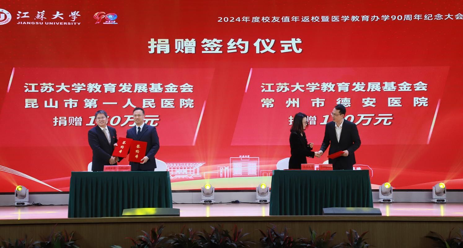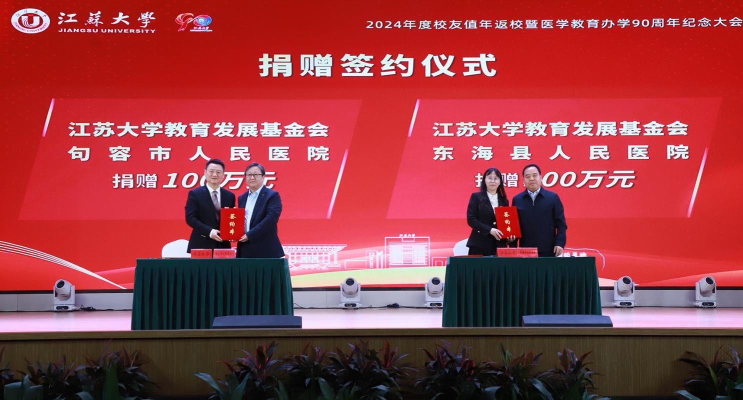 纪念大会上举行了捐赠签约仪式。昆山市第一人民医院捐赠150万元,设立乐鱼线上平台(集团)官方网站附属昆山医院医学基金;常州市德安医院捐赠150万元,设立乐鱼线上平台(集团)官方网站医学发展基金—常州德安基金;句容市人民医院捐赠100万元,设立乐鱼线上平台(集团)官方网站附属句容医院医学基金;东海县人民医院捐赠100万元设立东海人民医院医学基金。昆山市第一人民医院院长李翀、常州市德安医院院长黄孝峰与邹小波、蔡英凤共同签约。句容市人民医院党委书记笪爱华、东海县人民医院副院长许夫杰与乐鱼线上平台(集团)官方网站医学院党委书记邱健、院长钱晖共同签约。
