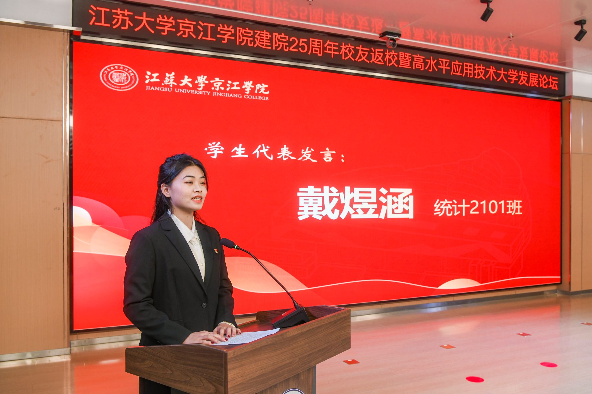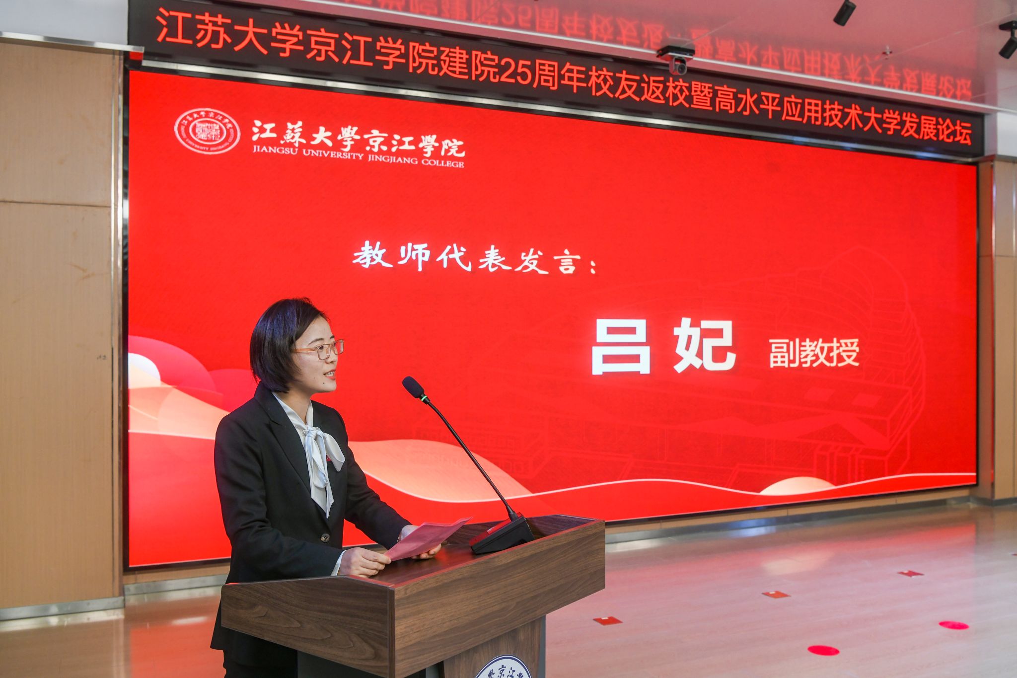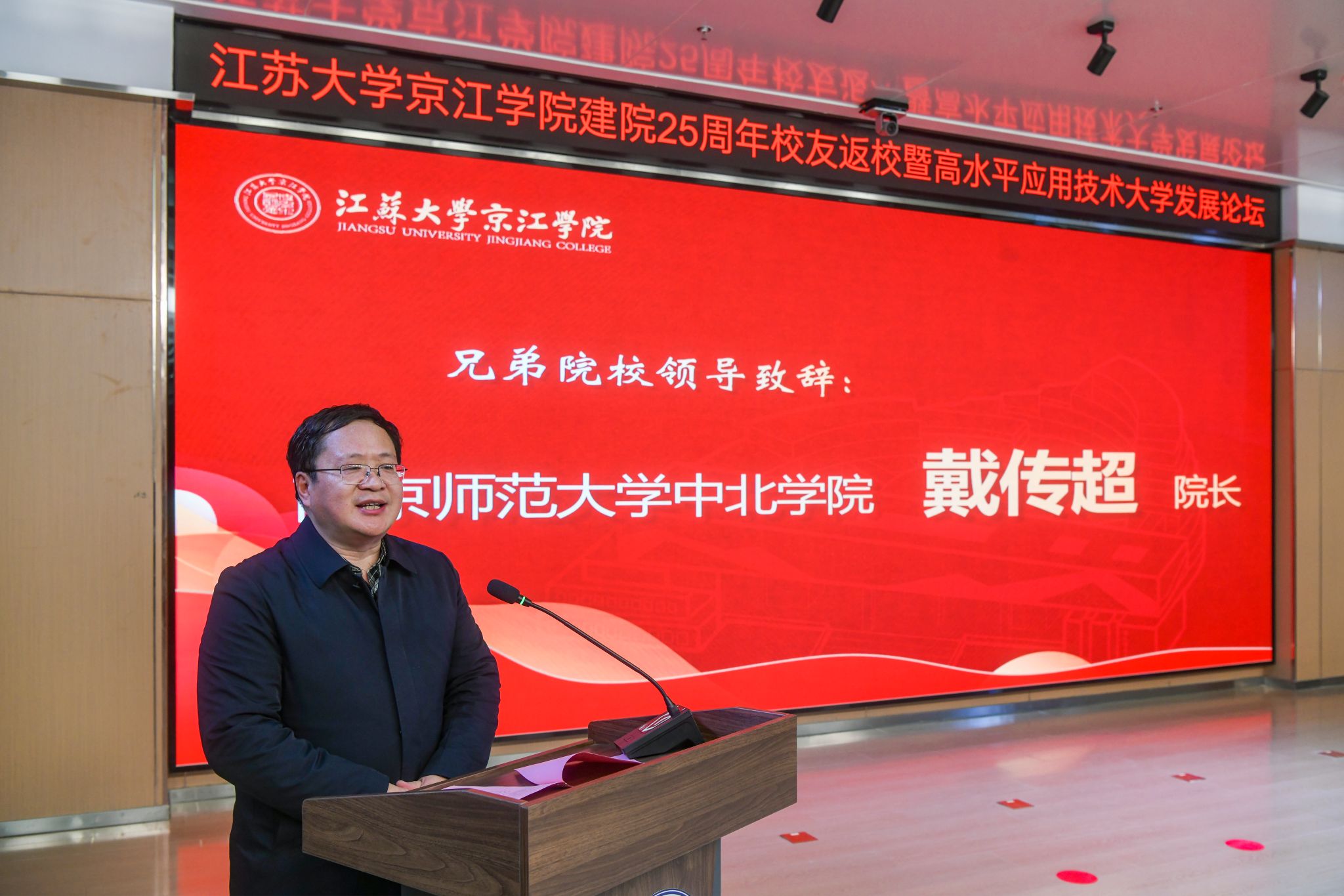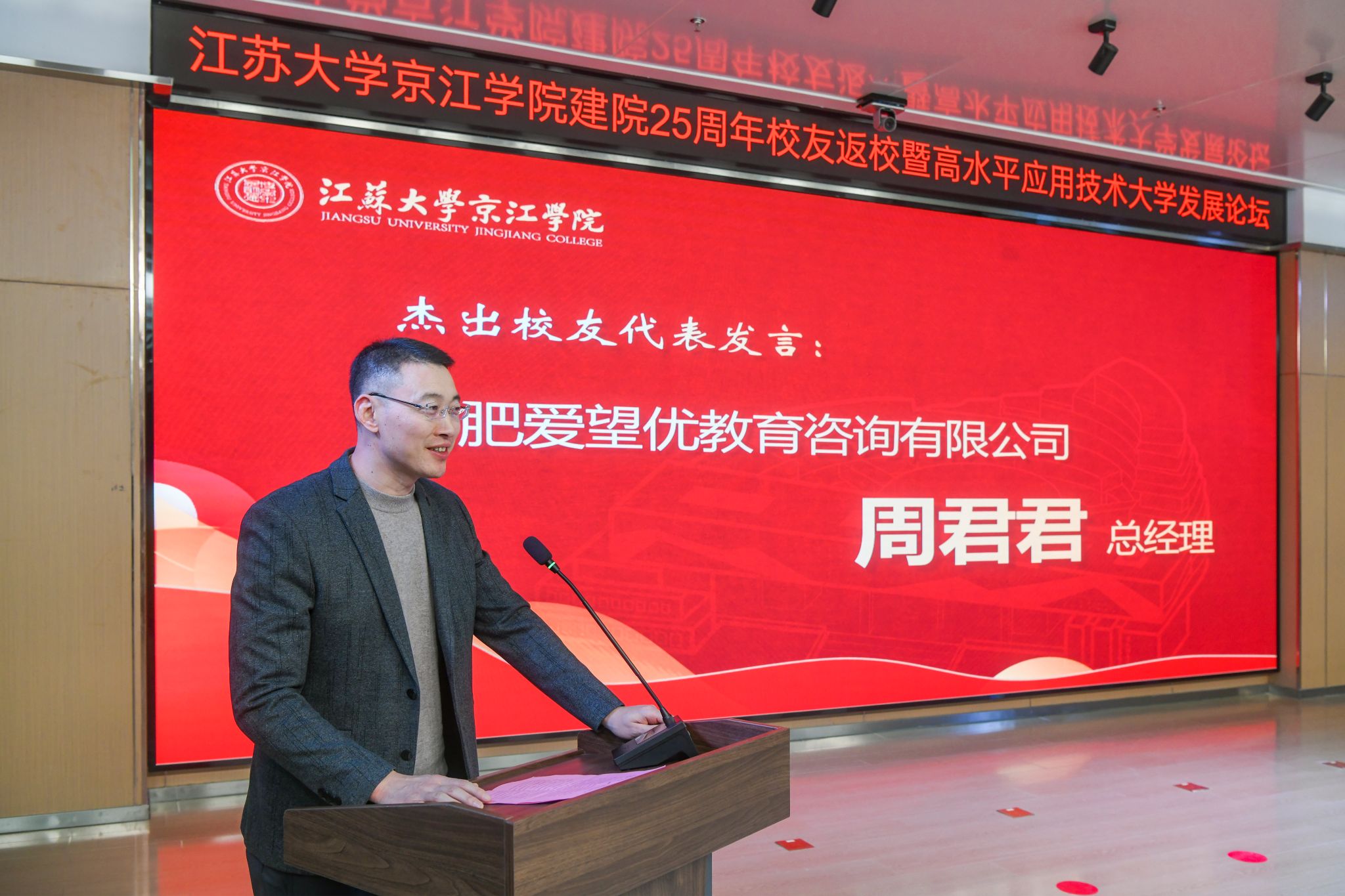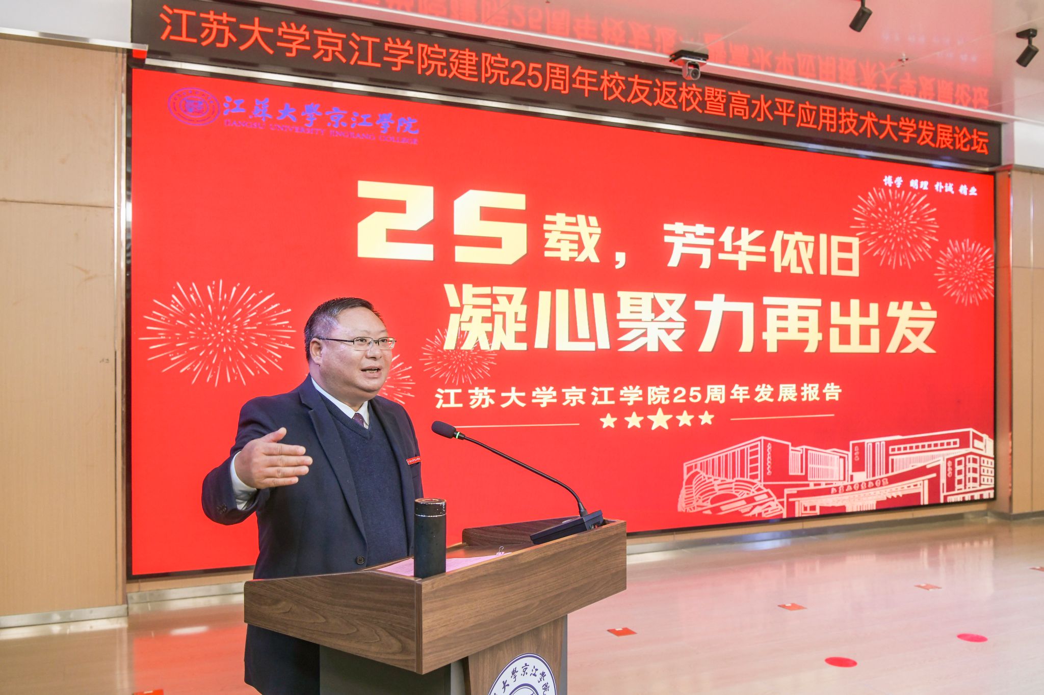 12月21日,京江学院在学术交流中心报告厅举行建院25周年校友返校暨高水平应用技术大学发展论坛。镇江市政协副主席、乐鱼线上平台(集团)官方网站副校长陈红,镇江市发展和改革委员会副主任朱华,南京师范大学中北学院院长戴传超,校友会与对外联络办公室主任李国昊,企业代表,京江学院全体院领导、校友代表、教师代表、学生代表出席大会。