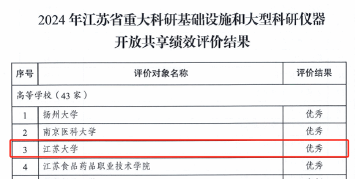 近日,江苏省科技厅、发改委、财政厅、教育厅联合发文,公布2024年大型科研仪器开放共享绩效评价结果,我校再次获评“优秀”等次。这是我校自2020年以来连续第五年获得该项荣誉,彰显了我校在大型科学仪器设备管理、共享服务及资源利用方面的成效。