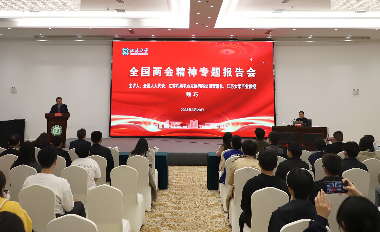 3月29日,乐鱼线上平台(集团)官方网站全国两会精神专题报告会在青教公寓多功能厅举行。全国人大代表、镇江市镇江新区永兴农机机械化专业合作社理事长、江苏润果农业发展有限公司董事长、乐鱼线上平台(集团)官方网站产业教授魏巧走进校园,为师生作全国两会精神专题报告。报告会由校党委常委、宣传部部长杨道建主持。
