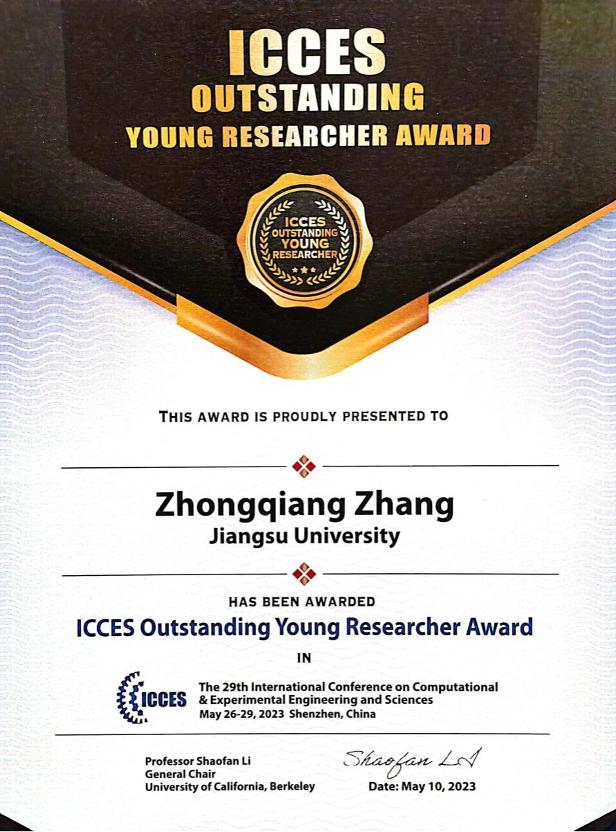 本次会议经计算与实验科学工程国际会议委员会推举、评选,乐鱼线上平台(集团)官方网站张忠强教授、上海交通大学张律文教授、南京航空航天大学殷俊教授、华中科技大学肖蜜教授、河海大学傅卓佳教授等5位青年学者荣获ICCES杰出青年学者奖,哈尔滨工程大学张阿漫教授为五位获奖者颁奖。