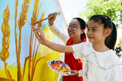 近日,江苏省镇江市润州区官塘桥街道平山村联合乐鱼线上平台(集团)官方网站志愿者带着村里的孩子一起在墙上描绘绿色生态、幸福生活主题墙画,扮靓美丽乡村。