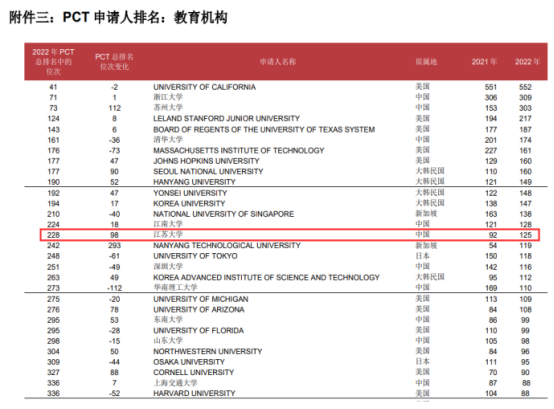 近日,世界知识产权组织(WIPO)官网发布了《专利合作条约》PCT专利申请情况,我校2022年PCT专利申请数为125件,在PCT申请人总排名228位,比2021年提升98位;在教育机构PCT申请人排名中,我校位列全球第15名、国内第五名,创历年最好成绩。