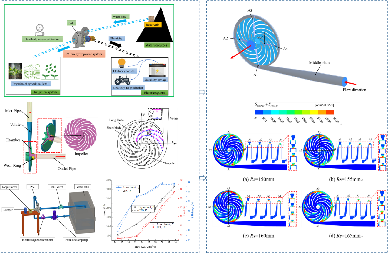 司乔瑞研究员团队在Energy发表论文,针对液力透平存在小流量下输出功率骤降,高效运行区窄等难题,以最大输出功率为目标,通过多目标智能优化设计平台,设计开发了比转速为16.52的超低比转速液力透平。采用试验测试与熵产分析法揭示了超低比转速液力透平功率输出特性以及能量损失特性。这一研究成果拓宽了超低比转速的高效运行区间,揭示了液力透平输出功率陡降与蜗壳出口水流方向、叶轮叶型及安放角间的关联关系,对拓宽超低比转速液力透平高效区及输出功率提供了理论指导。