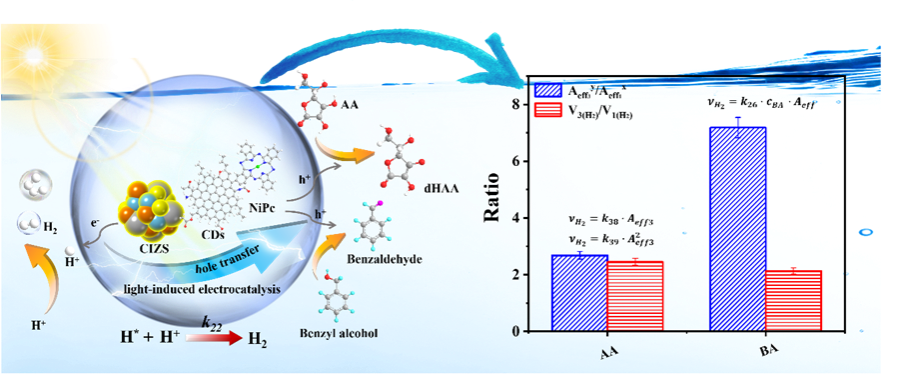 毛宝东、颜伟城和施伟东教授团队将NiPc修饰碳点与Cu-In-Zn-S量子点相结合,实现了苯甲醇氧化偶联析氢活性大幅度提升,并可用于糠醇等生物质体系。基于电荷提取、质子生成(通过不同的牺牲有机物)和表面活性位点的相互作用动力学数据,为有效表面电荷和析氢中心控制的质子还原过程奠定了准定量的分析,也为设计与有机氧化耦联析氢光催化剂设计提供了新的启发。相关成果发表于Adv. Funct. Mater.。