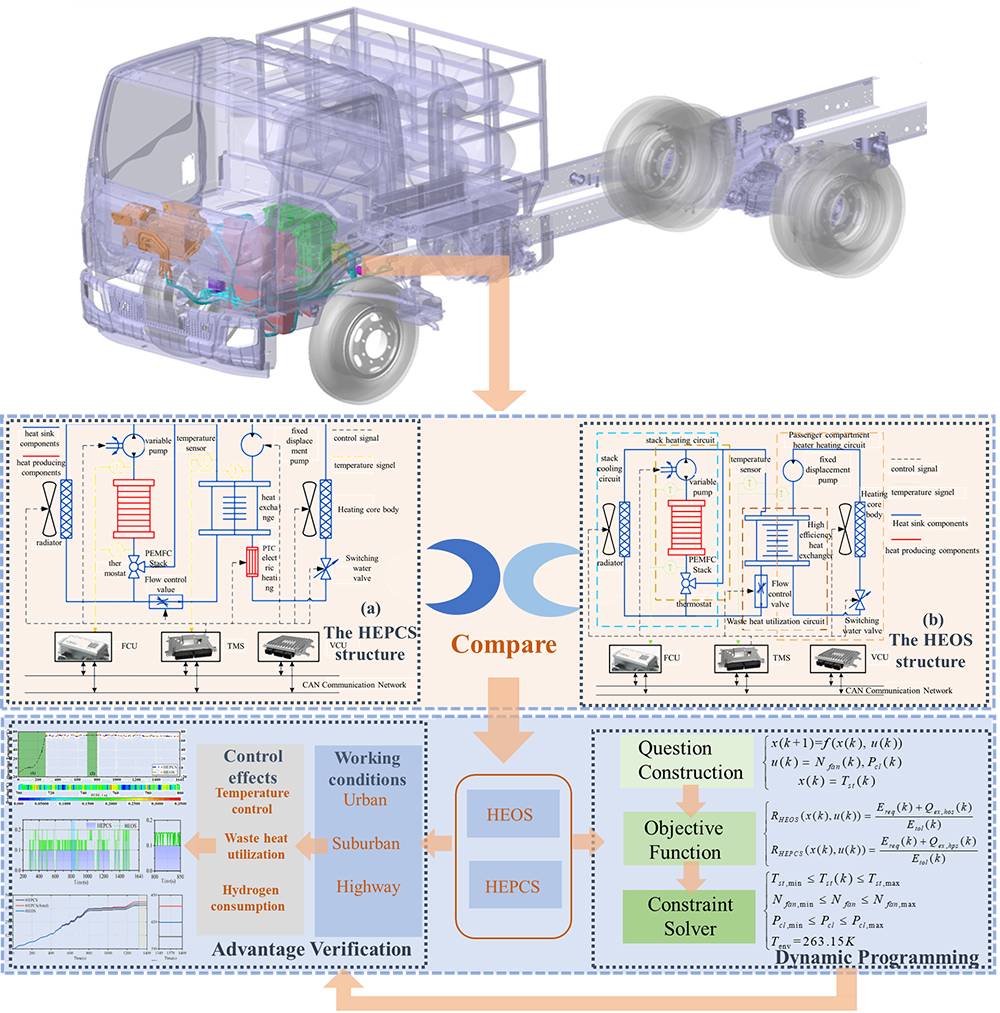胡东海副教授在Journal of Cleaner Production发表论文,提出了一种无PTC式的燃料电池汽车热管理系统(HEOS),并进行了基于全局优化的热力学建模和控制量仿真以评估HEOS余热利用的有效性。所提出的HEOS将PTC移除,改用高效换热器以满足低温环境下供暖需求,同时实现了燃料电池全局最优节能控制效果。结果表明,HEOS 在供热性能和节能方面超过热交换器和PTC联合热管理系统(HEPCS)。