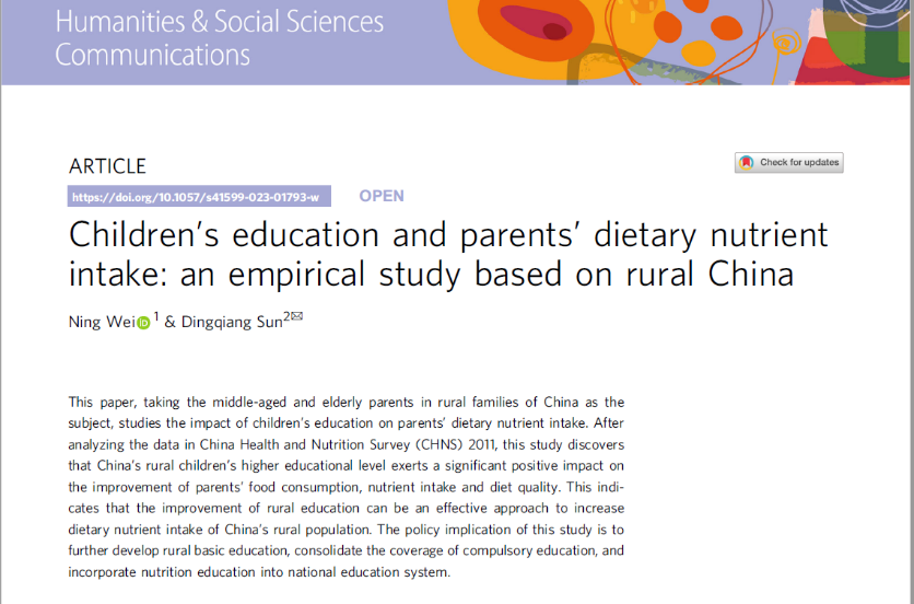魏宁老师在Humanities & Social Sciences Communications上发表论文,以中国农村家庭中的中老年父母为研究对象,考察了子女教育对其父母膳食营养摄入的影响。研究发现,中国农村子女受教育程度的提高对父母食物消费、营养摄入和膳食质量的改善具有显著的正向影响。这表明通过改善农村的教育现状,可以成为增进中国农村人口膳食营养摄入的有效途径。该文最终提出应继续加强农村基础教育建设,巩固义务教育普及成果,并将营养教育纳入国民教育体系。