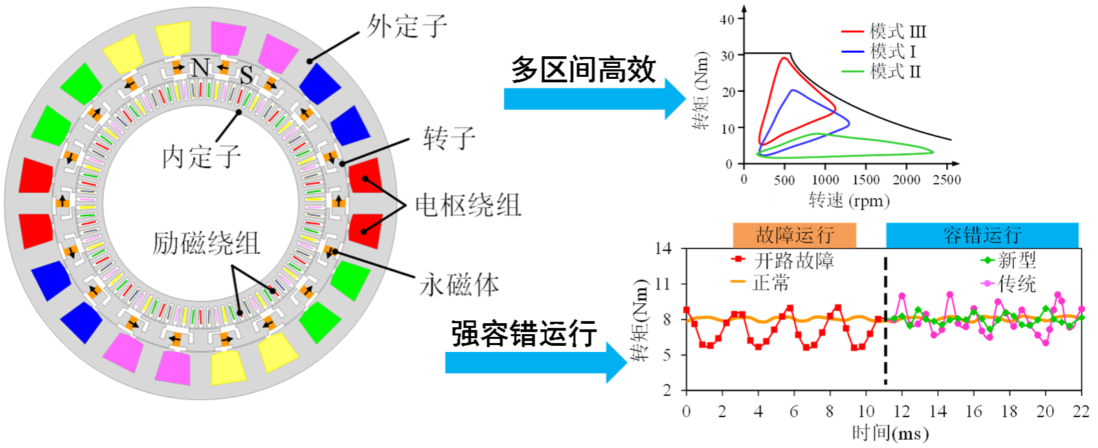 陈前教授团队在IEEE Transactions on Energy Conversion发表论文,提出了一种多运行模式高效永磁容错电机系统,该电机有主驱单独出力、辅驱单独出力、主驱/辅驱同时出力以及混合励磁四种运行模式,在不同运行模式形成了多个高效率区间,从而拓宽复杂运行工况下的高效区。此外,由于该新型电机附加了模式切换和磁场调节这两个控制自由度,提出了一种将模式切换和健康绕组补偿电流相结合的强容错运行方法,保证了电机在故障情况下的高效、平稳运行。该电机系统非常适用于电动车辆、飞行器等复杂运行工况。