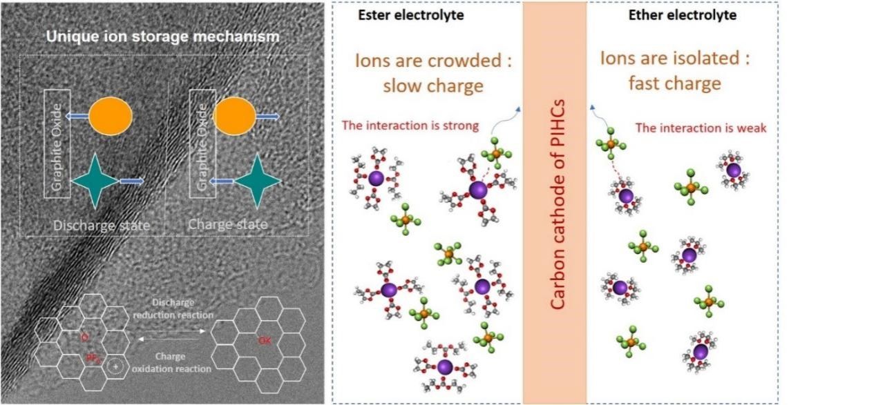 张成林特聘教授与德国伊尔梅瑙工业大学雷勇教授、乐鱼线上平台(集团)官方网站施伟东教授和温州大学王舜教授合作,在Advanced Functional Materials上发表文章,系统地分析了不同电解液作用于钾离子混合电容器正极的电化学性能差异,基于实验和理论计算的分析结果提出:醚类电解液的溶剂化结构中阴离子和阳离子相对弱的作用力使得其在电极界面的去阴离子能力更强,从而更有利于阴阳离子在电极界面的离子扩散。基于含氧碳正极界面的双离子存储机制,这一特点将确保其具有更高倍率的双离子存储性能。该研究为未来高性能钾离子混合电容器电解液的设计提供了实验和理论依据。
