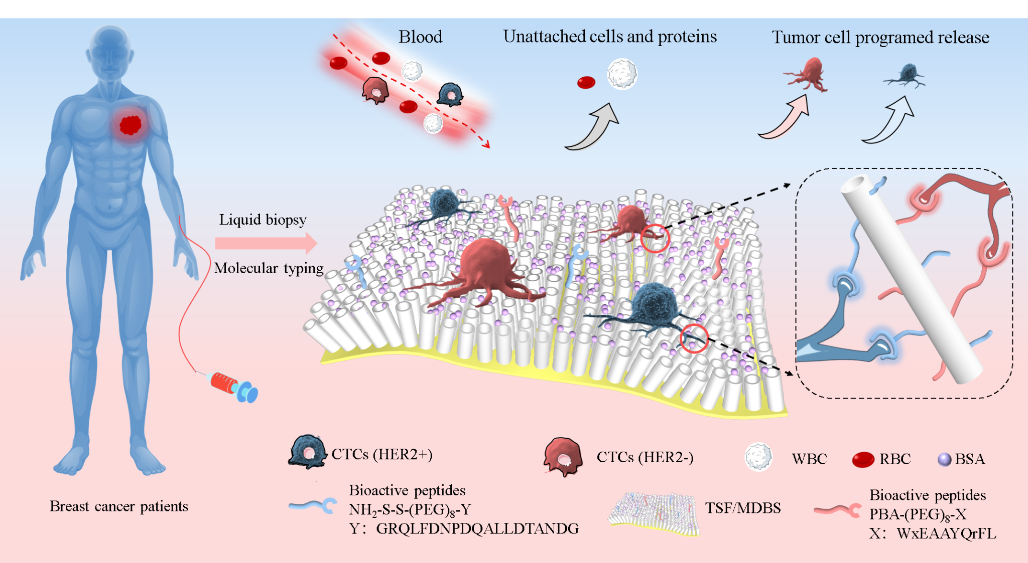 新材料研究院刘磊研究员团队将化学(分子识别)、物理(微/纳米拓扑相互作用)与机械(柔性)作用相结合构建类细胞外基质(ECM)的“软”生物活性界面,暨一种TiO2纳米管/丝素蛋白柔性自支撑复合膜,可用于识别并捕获具有不同表面标记物的CTCs并对其进行分选,实现对乳腺癌的分子分型诊断。相关成果发表于Advanced Materials。