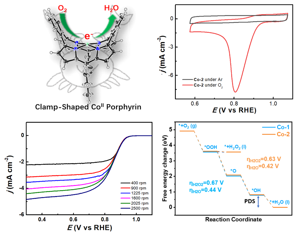 邱凤仙教授课题组在国际权威学术期刊Angewandte Chemie International Edition上发表最新研究成果,该工作设计并合成了一类新型的弯曲型卟啉钴配合物,该配合物的独特弯曲型分子结构和中心配入的钴金属离子,使其具有优异的电催化氧还原(ORR)4e-选择性。密度泛函理论(DFT)计算揭示了4e-选择性的较低过电势。该研究为新型的ORR分子催化剂的设计合成和实际应用开辟了新的途径。