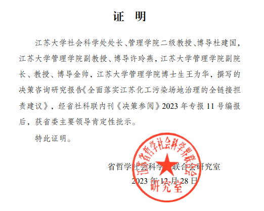杜建国教授团队撰写的研究成果《全面落实江苏化工污染场地治理的全链接担责建议》经省社科联内刊《决策参阅》2023年专报11号编报后,获省委主要领导肯定性批示。该文建议江苏在产业结构升级和城市布局优化调整过程中,应当对被关闭化工企业遗留场地环境污染进行快速全面的治理修复,并开展分类研判,系统布局构建责任追究体系;实施建章立制,实现责任“传导-追溯”闭环管理;鼓励市场激励,多方监督确保利益均衡。