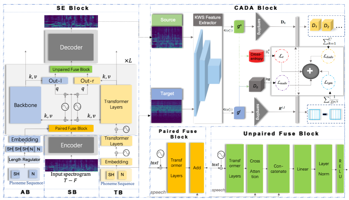 毛启容教授团队提出了一种基于文本辅助的高效语音增强方法,用于提升语音关键词检测系统的抗噪声性能。研究提出了一种创新的、基于域自适应的文本辅助去噪技术,显著提升高噪声环境下关键词识别的准确度和可靠性。该技术构建了一个包含语音分支、对齐分支、文本分支三个核心分支的结构,通过多阶段训练,形成了一种适用于不同应用场景的通用语音降噪技术。实验结果显示,该技术不仅显著提高了严重受损语音的可理解度,同时在轻微受损语音的处理上也达到了最先进的性能表现,从而增强了主流关键词识别模型的普适性和有效性。相关研究成果发表于国际多媒体顶级会议ACM International Conference on Multimedia 2023,并作大会口头报告。