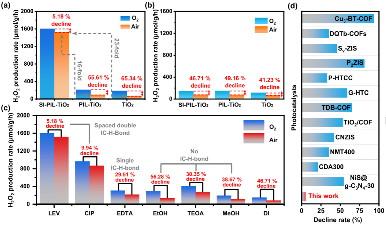 由SI-PIL-TiO2表面的亚氨基团和LEV的羰基基团形成的IC-H-bond对空气中O2的还原具有独特优势。首先,它能将咪唑活性位点的从被覆盖状态转换为完全暴露状态,以屏蔽电子供体的无序吸附和空气中氮气对活性位点的抢占。其次,IC-H-bond使得咪唑活性位点形成了更强的正电势和更亲和力的O2轨道结合模式,这为选择性化学吸附O2建立一种独特的具有竞争力的咪唑活性位点。最终,具有IC-H-bond作用的光催化体系在空气中实现了1518µmol/g/h的H2O2产率,且达到了94.8%的总O2利用率和转化效率,是没有隔位双氢键的光催化体系的16倍。