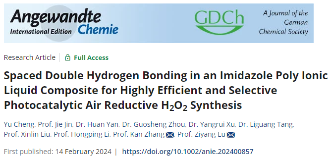 近日,我校最新研究论文“Spaced Double Hydrogen Bonding in an Imidazole Poly Ionic Liquid Composite for Highly Efficient and Selective Photocatalytic Air Reductive H2O2 Synthesis”在《德国应用化学》(Angewandte Chemie-International Edition )(IF:16.6)上在线发表。乐鱼线上平台(集团)官方网站为第一完成单位,环境与安全工程学院硕士研究生程煜、教师金杰为共同第一作者,教师逯子扬为通讯作者。