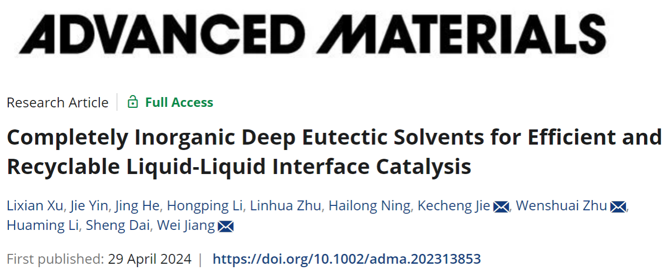 近日,我校能源研究院蒋伟副研究员团队在化学与材料领域顶级期刊《先进材料》(Advanced Materials)上在线发表研究论文“Completely Inorganic Deep Eutectic Solvents for Efficient and Recyclable Liquid-Liquid Interface Catalysis”。乐鱼线上平台(集团)官方网站为第一完成单位,能源研究院博士研究生徐丽仙为第一作者,蒋伟、南京大学揭克诚教授与乐鱼线上平台(集团)官方网站朱文帅教授为共同通讯作者。